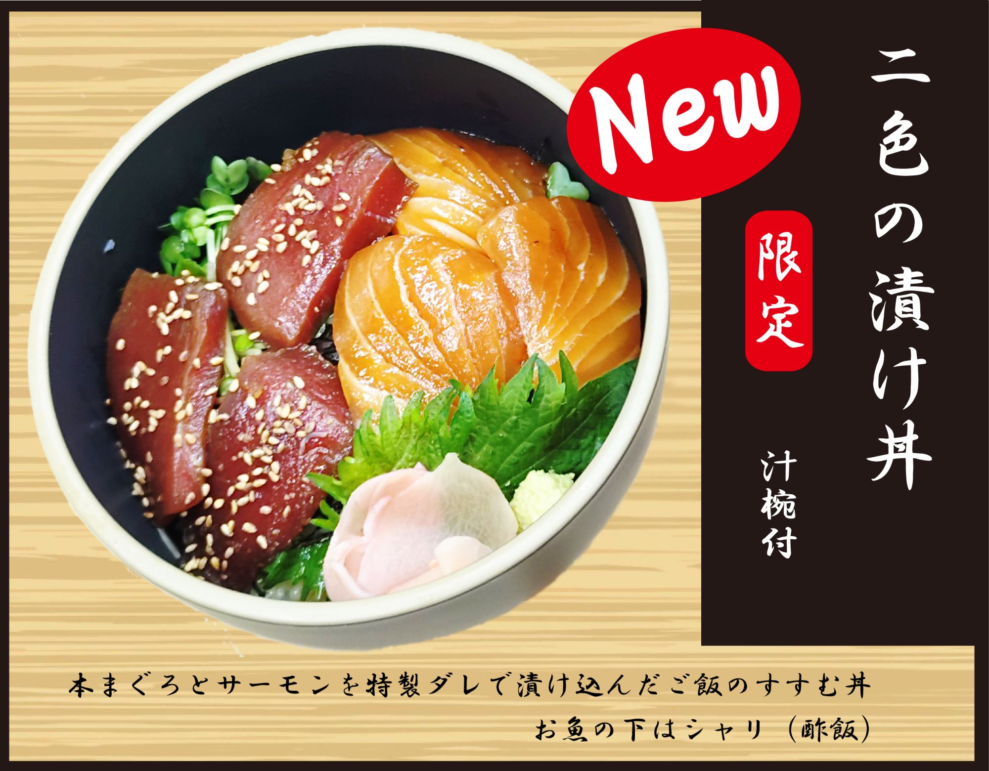 本まぐろとサーモンを特製ダレに漬け込んだ